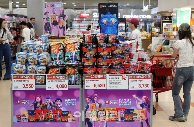 [이데일리 김태형 기자] 서울 중구 롯데마트서울역점에 전시된 케데헌 협업 상품