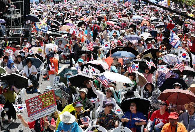 | | 광복절 연휴 둘째 날인 16일 오후 서울 종로구 세종대로 일대에서 열린 대한민국바로세우기국민운동본부 주최 ‘광복 80주년 8.15 국가정상화를 위한 광화문 국민대회’에서 참가자들이 태극기와 성조기를 흔들며 구호를 외치고 있다. (사진=뉴스1) |