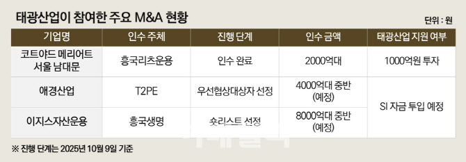 올해 태광산업의 인수합병(M&A)은 지난 4월 코트야드 메리어트 서울 남대문(남코야) 확보에서 시작됐다. 인수 가격은 2000억원으로, 계열사인 흥국리츠운용이 인수 주체로 나섰고 태광산업은 SI로 1000억원 규모 자금 출자를 확약했다. 태광그룹은 흥국생명 본사 등 소유 건물 6곳을 남대문 일대에 집중시키며 ‘태광타운’ 청사진도 가시화했다.