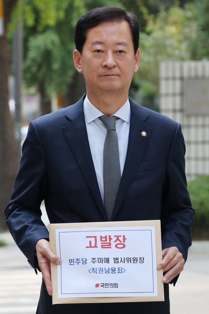| | 국민의힘 최은석 원내수석대변인이 26일 더불어민주당 추미애 법제사법위원회 위원장의 직권남용죄 관련 고발장을 제출하기 위해 서울경찰청 민원실로 향하고 있다. (사진=연합뉴스) |