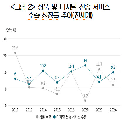 9일 대한상공회의소 SGI(지속성장이니셔티브)에 따르면 글로벌 디지털 전송 서비스 수출 규모는 지난 2010년 5391억달러에서 지난해 1조6209억달러로 세 배 이상 증가했다. 같은 기간 상품 수출이 등락을 반복한 것과는 대조적이다.