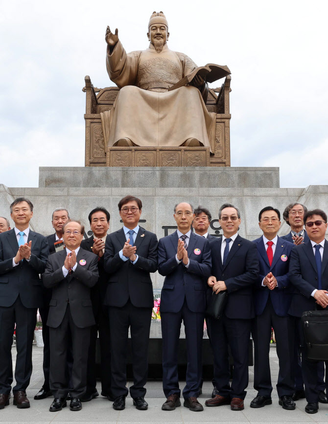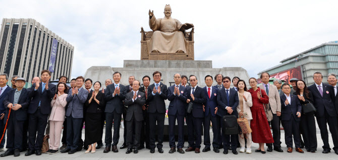 최휘영 문화체육관광부 장관이 579돌 한글날인 9일 오전 서울 광화문광장 세종대왕 동상 앞에서 한글·국어 관련 단체 관계자들과 기념촬영하고 있다. (사진=이데일리 방인권 기자).