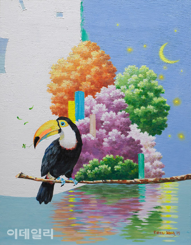 ‘도시 속 고요’(Stillness in the City·2025)는 섬이 돼 도시로 건너온 작가의 새로운 유토피아라고 할까. 검은 털 노란 부리의 새 ‘토코투칸’을 앞세워서. “아마존에 살면서 과일 씨앗을 퍼뜨려 생태계에 기여한다는 토코투칸을 문득 기억해냈다”는데. “누구나 품고 사는 오아시스, 하지만 정작 떠날 순 없는 이들을 위해 내줬다”는 ‘떠나고 싶은’ 섬이다.