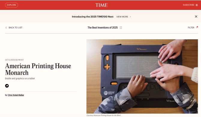 | | 미국 시사주간지 타임지에 2025년 10월 9일 소개 된 닷의 촉각디스플레이를 탑재한 모나크의 모습(사진=벤처기업협회) |