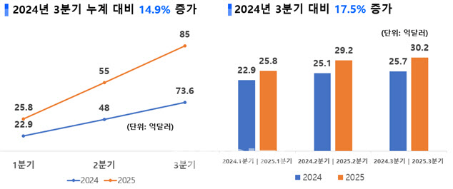 식품의약품안전처는 우리나라 화장품 2025년 3분기까지 수출 규모는 수출액이 가장 많았던 지난해 3분기까지 보다 14.9% 증가한 85억달러(잠정)를 기록했다고 2일 밝혔다. 이는 2023년 한 해 동안 수출액(85억 달러)을 올해 9개월 만에 달성한 것이며 3분기 수출 누적 최대치를 경신한 것이다.